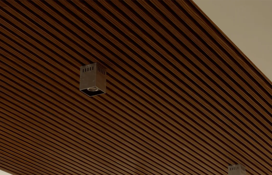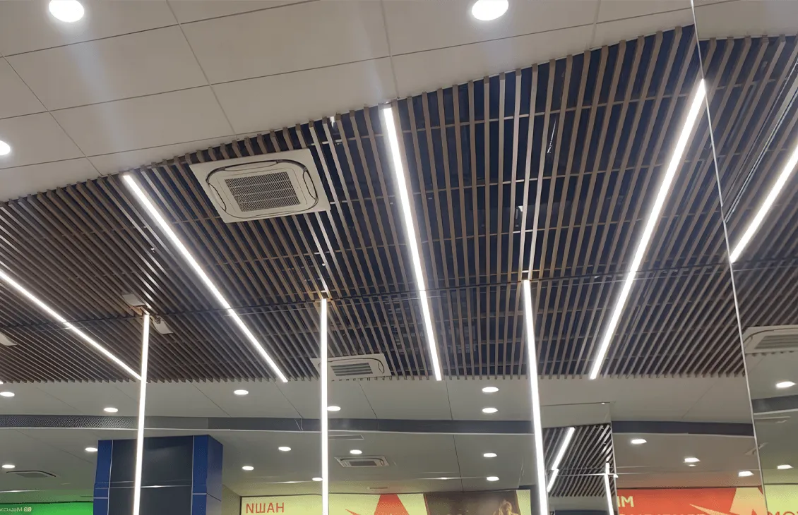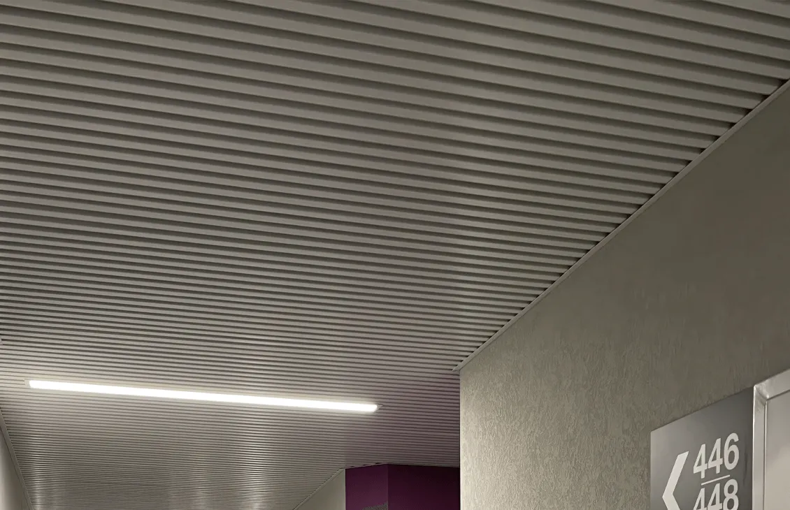 Монтаж осуществляется на гребёнку ВТ-4-50 (возможна также ВТ‑12‑50) с шагом 50 мм, что обеспечивает ровную сеточную структуру потолка и возможность быстрой замены реек без демонтажа всей системы. Доступна окраска по RAL, текстура под дерево и печать графики.