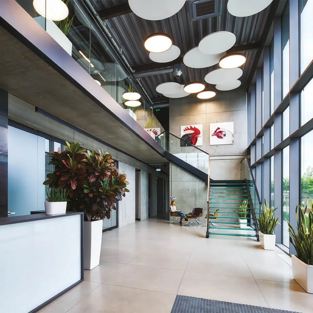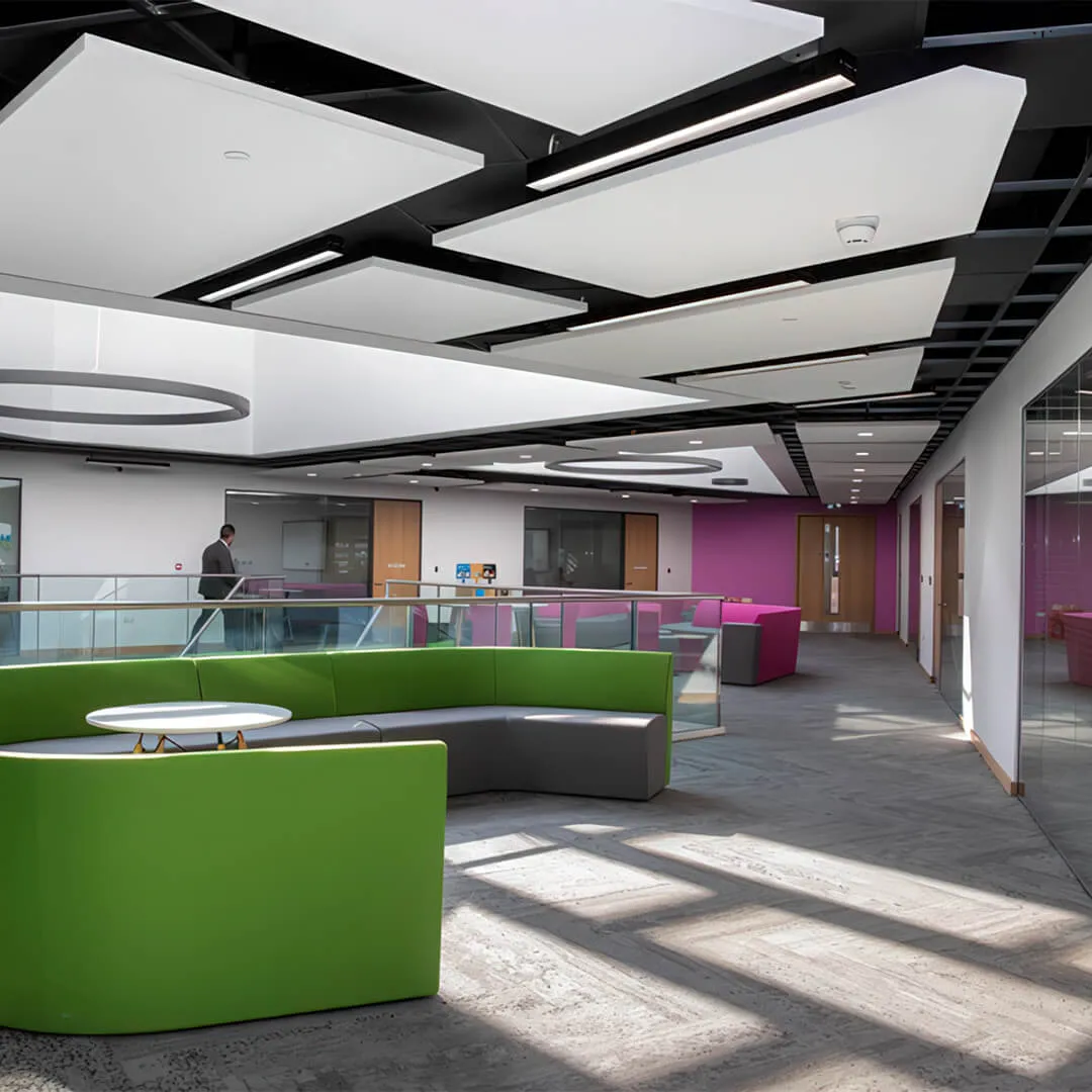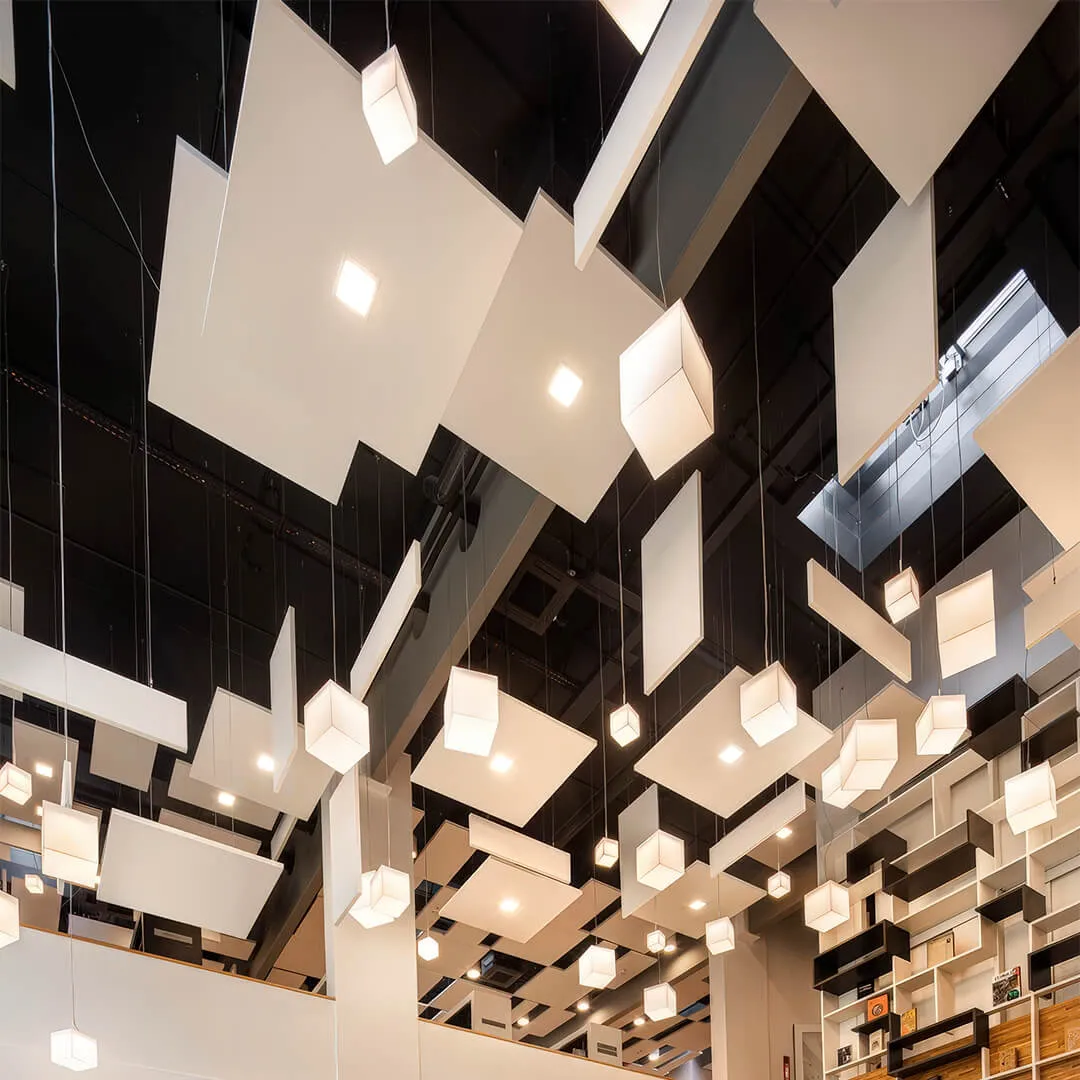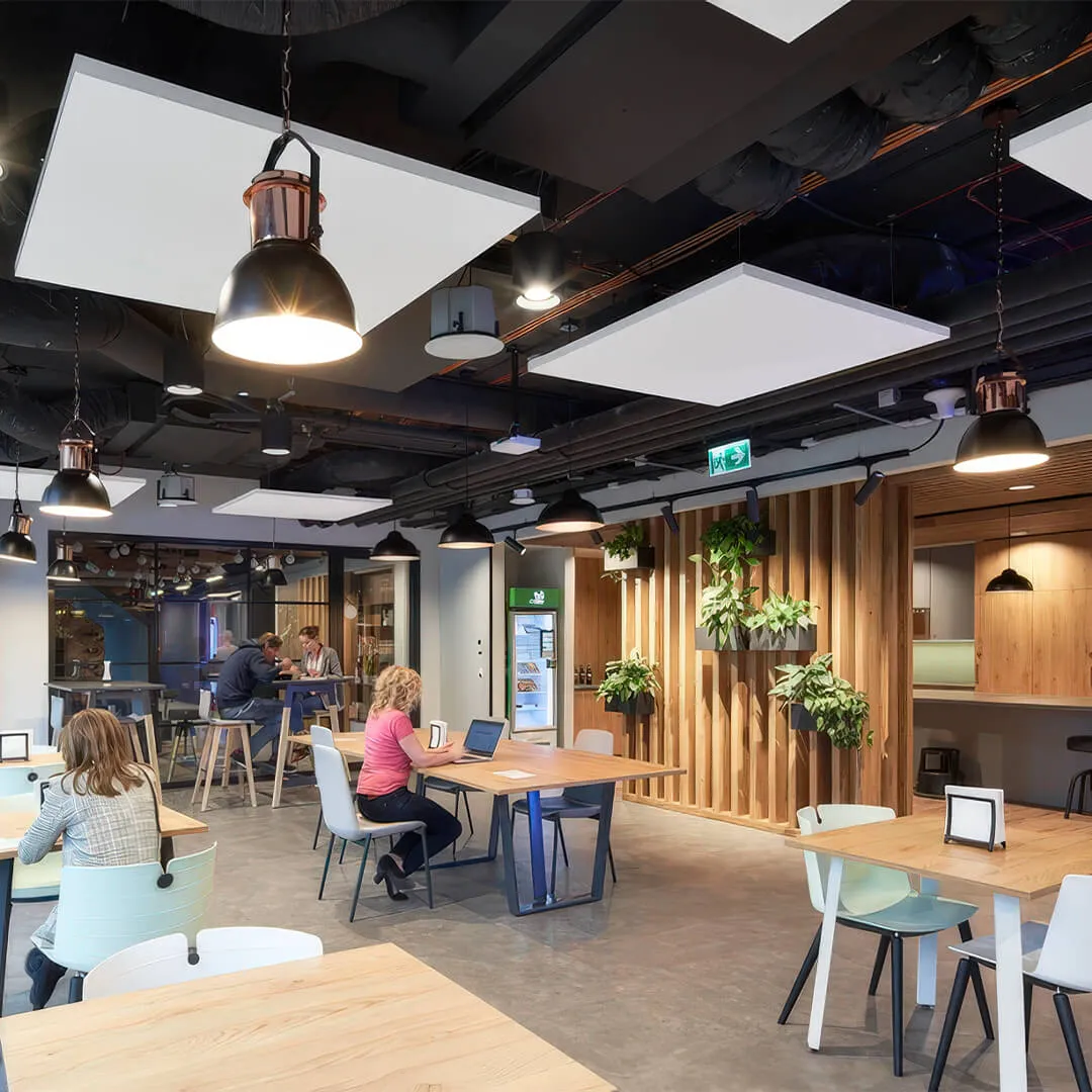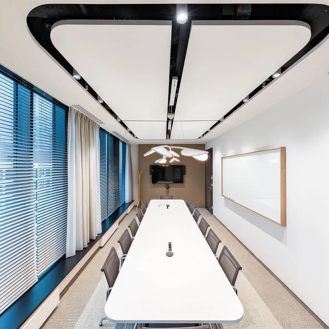 - Системы для открытых пространств: подвесные панели и облака, которые эффективно снижают шум в больших помещениях.