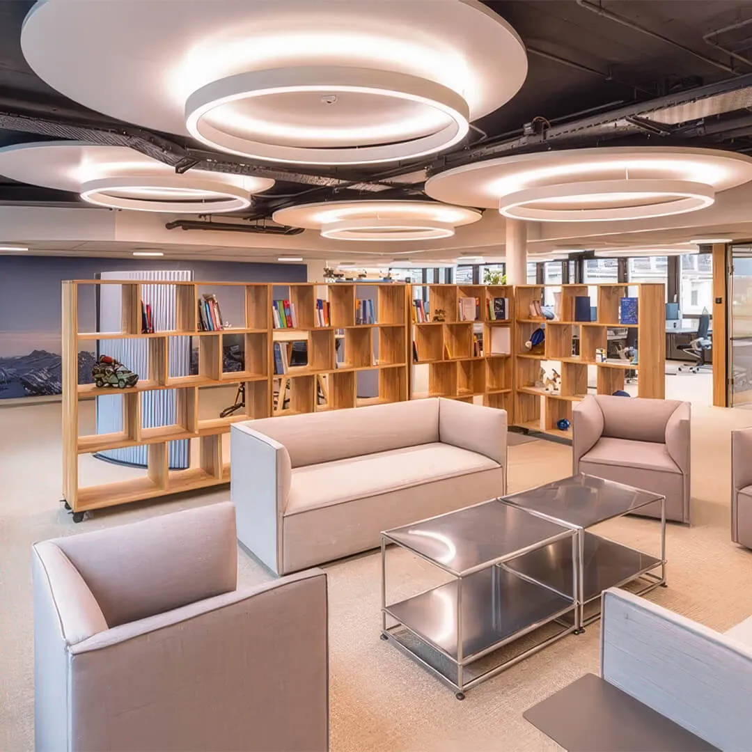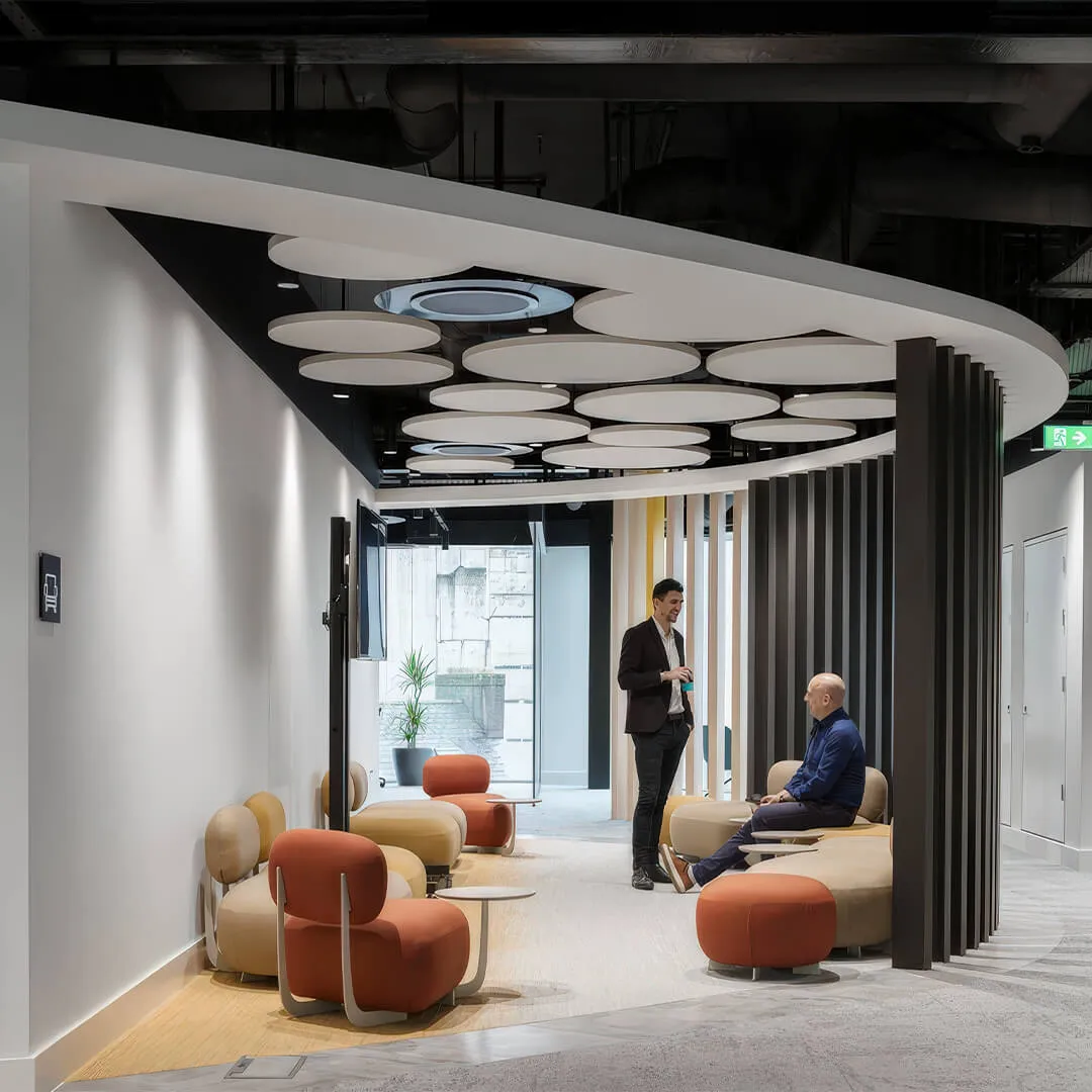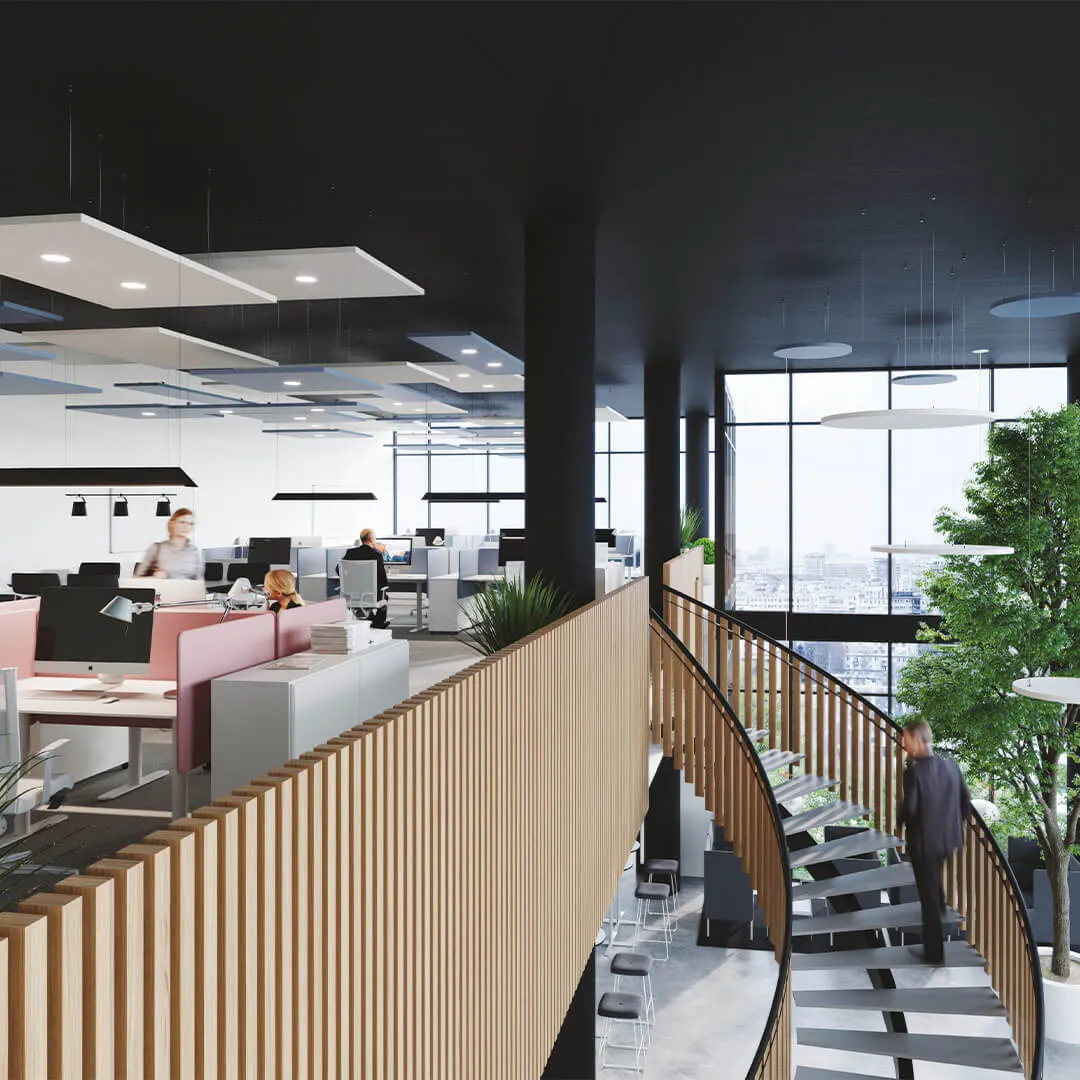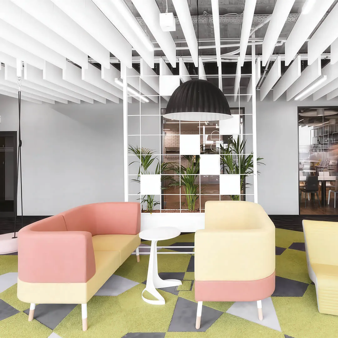 - Системы для открытых пространств: подвесные панели и облака, которые эффективно снижают шум в больших помещениях.