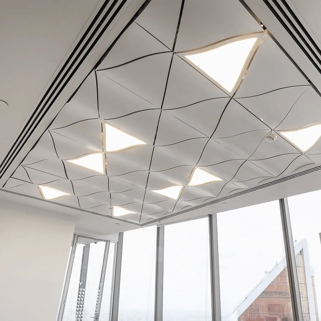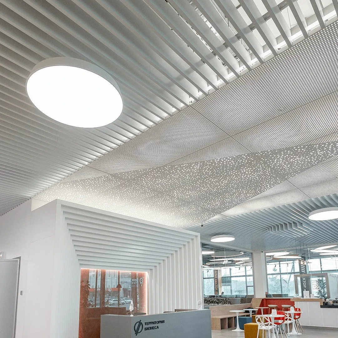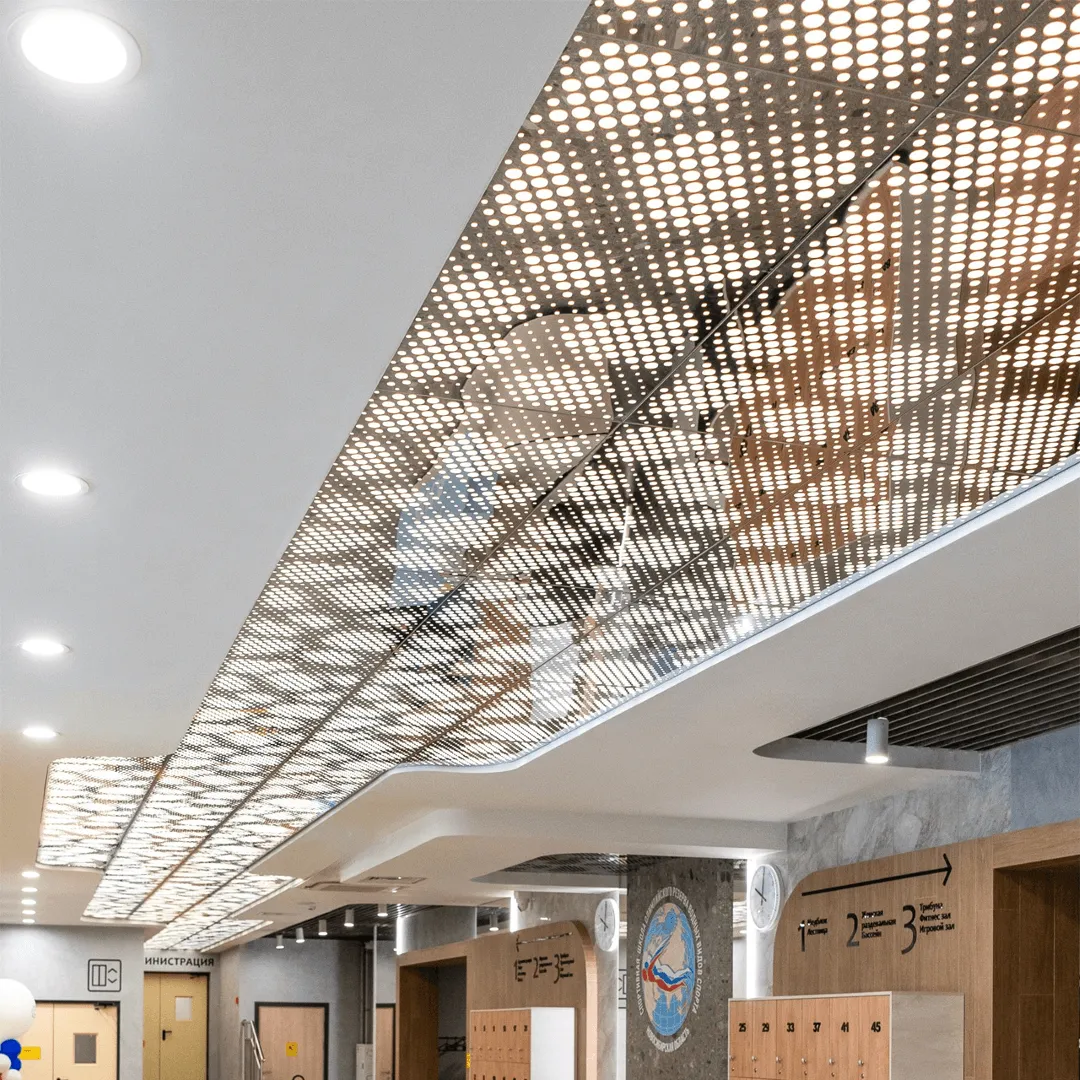 - Модульные 3D системы: металлические 3D модули для потолочных и стеновых конструкций, которые могут быть изготовлены по индивидуальным размерам и формам, с возможностью нанесения художественной перфорации.