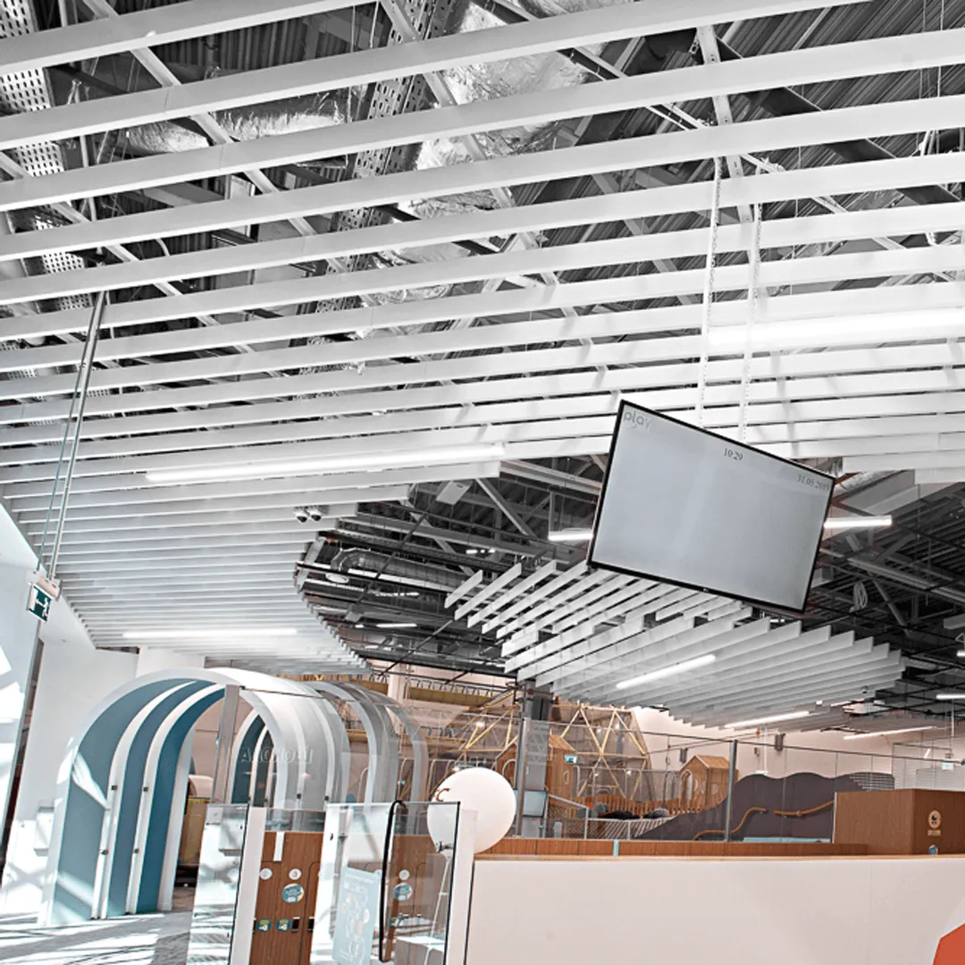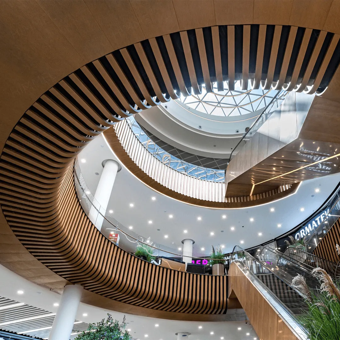 - Реечные потолочные и стеновые системы: металлические ламели, доступные в различных цветах по шкале RAL, а также с текстурами ценных пород дерева. Возможен монтаж в разных плоскостях и с различным шагом, включая установку "волной".